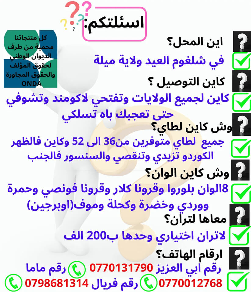 تصاميمنا موثقة ومحمية من طرف الديوان الوطني لحماية حقوق المؤلف والحقوق المجاورة وأي تقليد لها يعتبر سرقة للحقوق الملكية الفكرية للمصمم ويعرض صاحبها لعقوبات قانونية